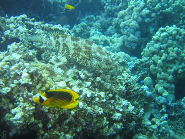 Hier ist mal ein Beispiel, dass diese gefleckten Zackenbarsche sich auch sehr gut tarnen können. Auf den ersten Blick ist er kaum von der Umgebung auszumachen.