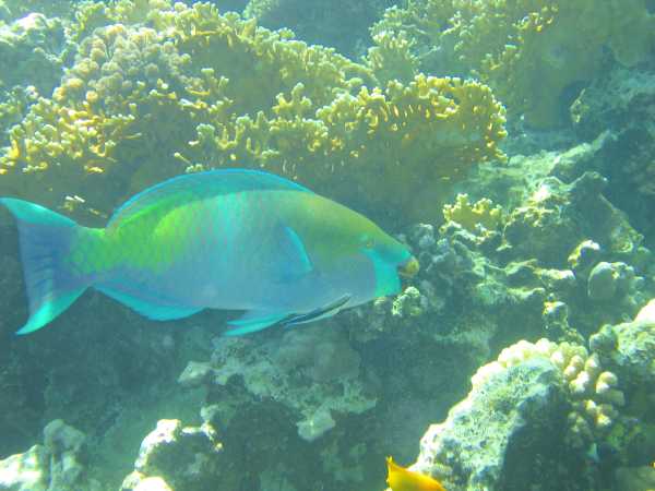 Auf diesem Bild kann man gut die Größenverhältnisse zwischen Putzerfisch (ca. 7cm) und einem großen Papageifisch (ca. 40cm) sehen. Im Übrigen kann man am Maul des Papageifisches sehen, dass er gerade kräftig die Algen von den Korallen abgegrast hat.