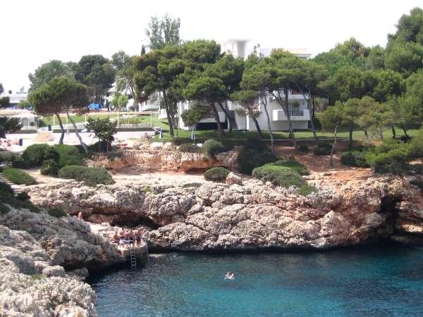Hier ist der Blick von einer Landzunge über die Bucht Cala Azul zum Hotel Azul Park. Am Hotel sieht man den Einstieg in die Cala Azul über zwei Leitern.